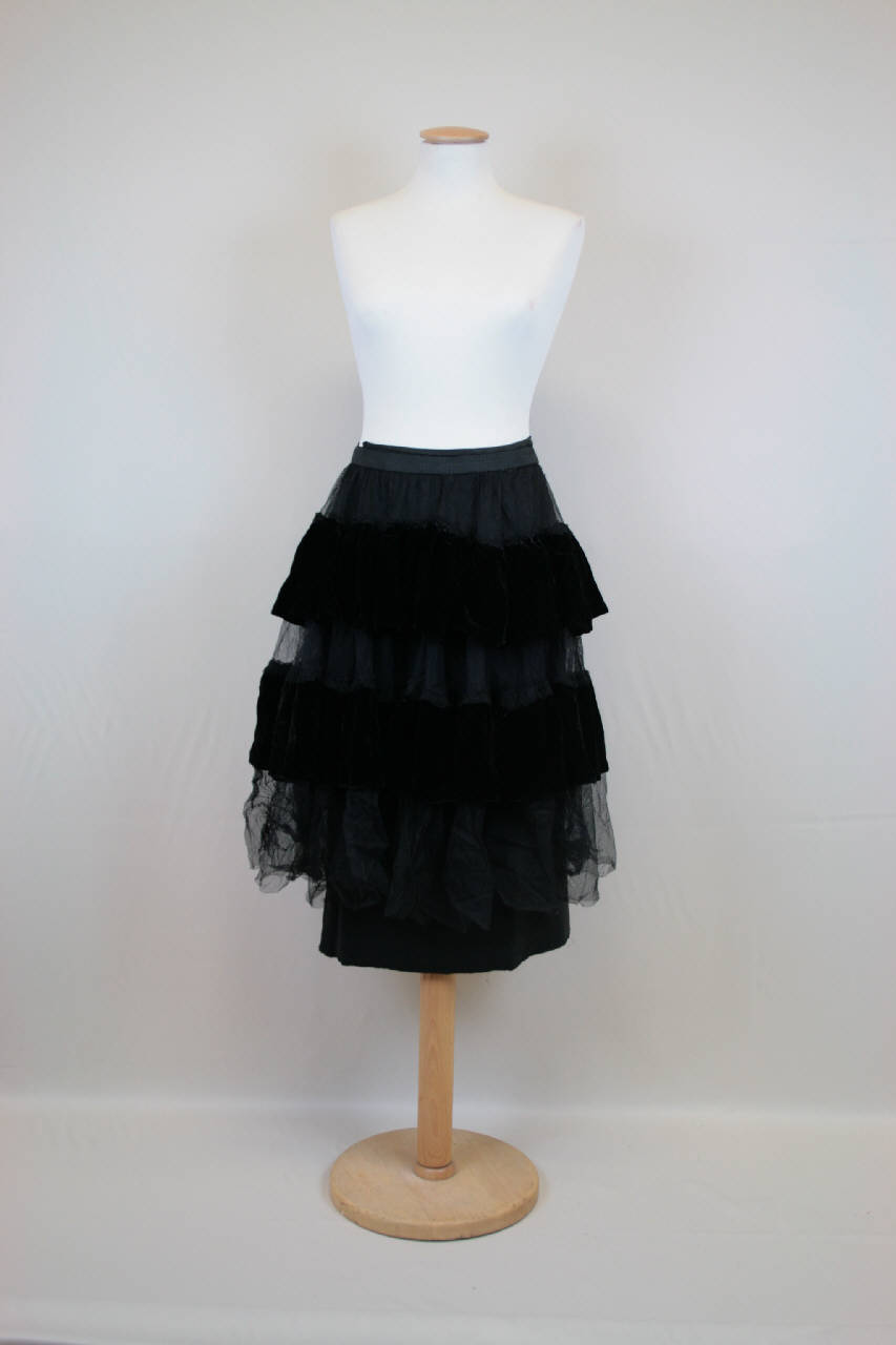 Gonna lunga sotto il ginocchio, in tulle nero con due gale arricciate in velluto nero. Stretta in vita da nastro gros elastico e chiusa da ganci. Sottogonna staccata in taffetas leggero nero, con alta banda all'orlo in crespo nero pesante; apertura con cerniera.