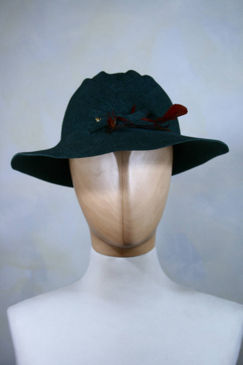 Cappello a cloche in feltro verde-grigio. Calotta a cupola, con quattro pieghe lungitudinali simmetriche cucite a formare motivo a V davanti e dietro. Davanti al centro due nastrini di feltro incrociati trattengono un piccolo ciuffo di piume rosso mattone e marrone. Giro d'entrata in nastro gros marrone. All'interno, sul dietro, etichetta in nastro operato alla quale sono cuciti due nastrini con numero del modello "41.974" e "Paris".