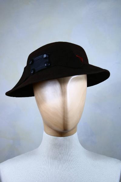 Cappello in feltro marrone, con calotta bassa e tesa leggermente abbassata, più stretta sul dietro. Sottile cinta in feltro e, sul davanti, finto fiocco in feltro con impunture, trattenuto da finto largo passante in pelle marrone con quattro bottoni decorativi ricoperti in pelle. La tesa ha piccolo bordo ripiegato in alto e impunturato.\nGiro d'entrata in nastro marrone, elastico tubolare per fissaggio.\nPerduta possibile fodera.