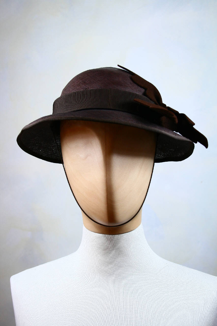 Cappello in paglia marrone rosato, con calotta a cupola e tesa leggermente convessa. Cinta e bordo della tesa in nastro gros marrone; bordo irrigidito da ferrino. Sul lato sinistro della cinta tre grandi foglie tipo quercia in feltro marrone. All'interno alta fascia in taffetas nero, ristretta in alto da arricciatura; fascia di supporto in paglia naturale in corrispondenza della cinta. Giro d'entrata in nastro gros marrone, elastico tubolare per fissaggio. All'interno, dietro, etichetta in nastro stampato.