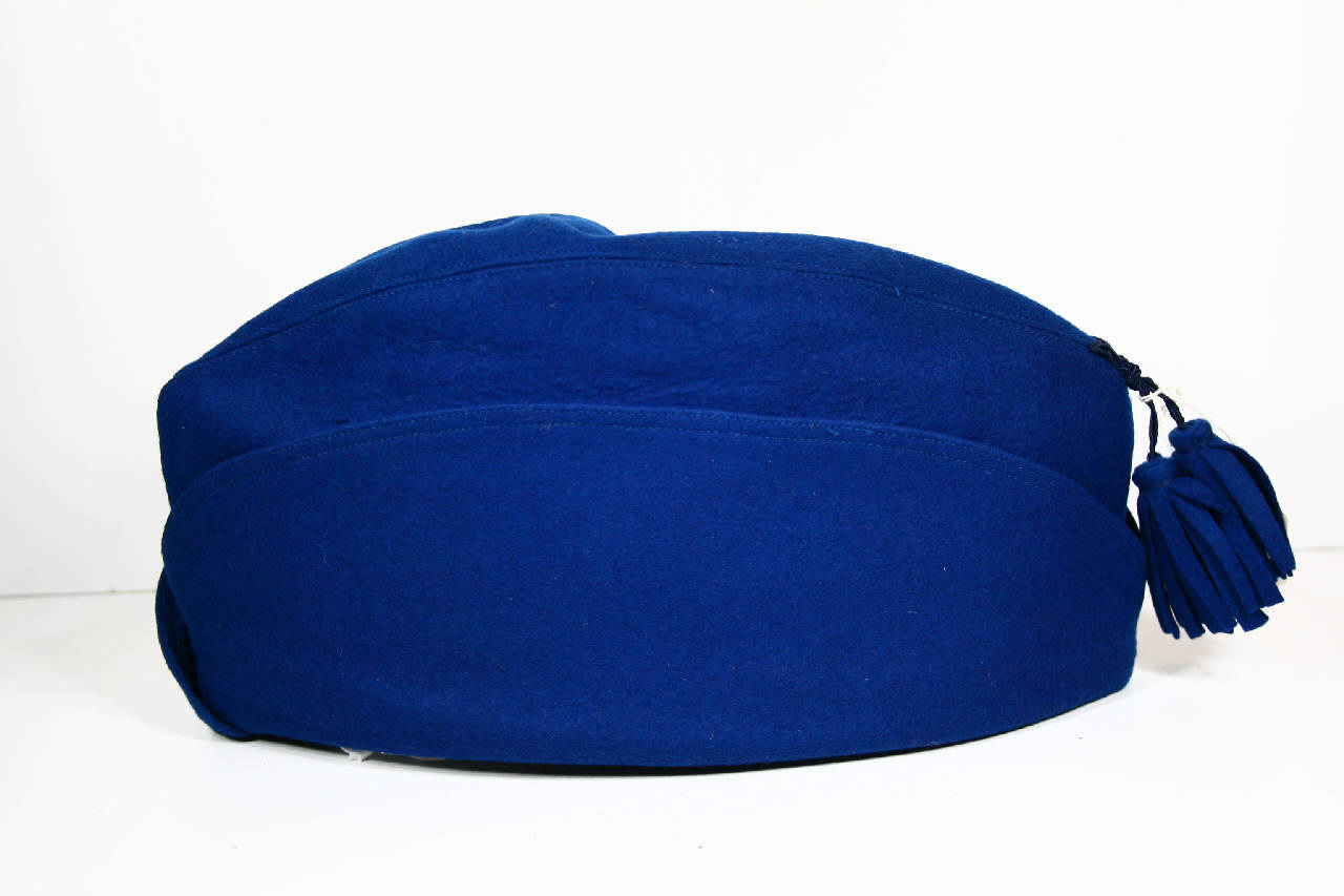 Cappello a bustina in feltro azzurro, con alette laterali rovesciate verso l'alto. Sul dietro coppia di nappe nello stesso tessuto. Fodera in diagonale celeste. All'interno, sulla cima, marchio a stampa. Etichetta in carta, danneggiata, con marchio non leggibile e numeri 58-7 1/8 indicanti la misura.