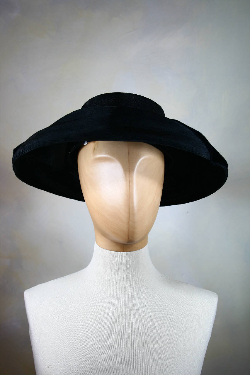 Cappellina in paglia nera. Calotta bassa, profilata da nastro di velluto nero annodato con lunghe cocche ricadenti lateralmente e fissate. Ampia tesa convessa movimentata da deformazioni irregolari concentriche. Giro d'entrata in doppio tulle rigido con ferrino. All'interno etichetta in nastro stampato.