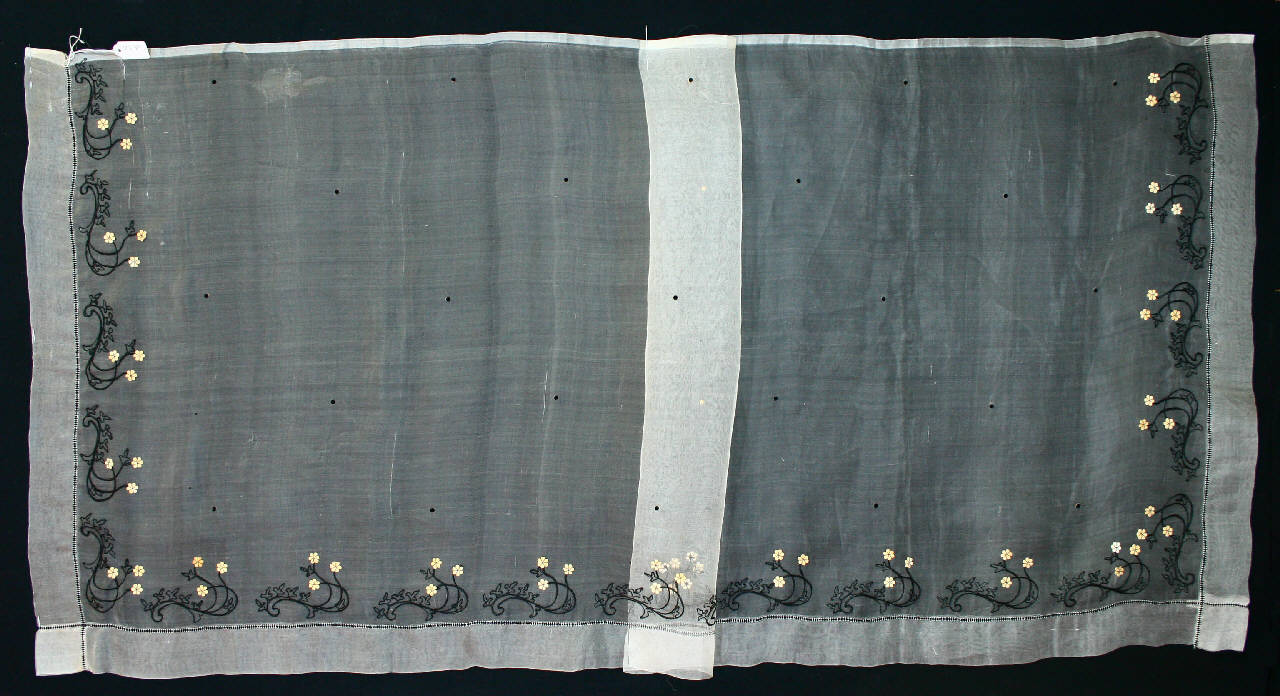 Stola in organza avorio, ricamata a macchina. Sui lati corti e uno dei lunghi orlo a giorno eseguito con filo nero e cornice data da motivi staccati ricamati a punto catenella: sottili volute con foglie trilobate, racemi e piccoli fiori a sei petali fissati a cucito, in carta rosata fustellata. Sul fondo sparsi pois in carta vellutata nera, incollati.