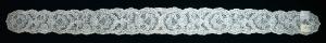 Unico pezzo composto da due barbe di cuffia cucite insieme con cucitura centrale. Realizzate in merletto di lino bianco sottilissimo, a fuselli a fili continui tipo Malines: motivi a punto tela con filo di contorno più spesso e fondo alternativamente a rete a cinque buchi e a ragnetti (point de neige). Cornici laterali formano medaglione ovale entro cui una coppia di foglie sostiene tre fiori a cinque petali; dal vertice dell'ovale si eleva una coppia di tulipani con bocci ricadenti oltre i quali è il medaglione successivo. \nI margini sono profilati da sottilissima passamaneria che produce effetto di picot.