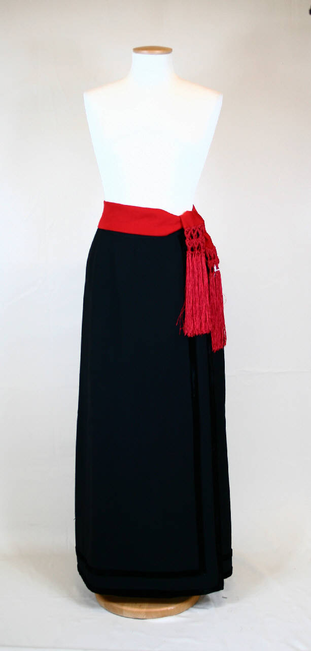 Gonna lunga alla caviglia, in crespo pesante nero, in tre teli a finto portafoglio. Profilata all'orlo e alla sovrammettitura da due giri di nastro di velluto nero. Cucitura centrale posteriore, con apertura chiusa da cerniera e cucitura sul fianco destro, dove è inserita una tasca a sacchetto. Fodera in taffetas nero. Alla gonna è abbinata una cintura a fusciacca, in jersey rosso lampone, con interno rigido e profilata alle estremità da merletto all'uncinetto con lunga frangia, in seta dello stesso colore. All'interno etichetta in nastro operato.