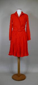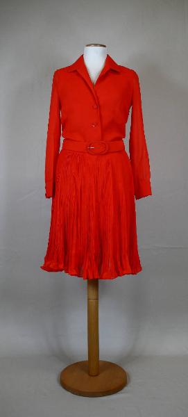 Abito chemisier, lungo sotto il ginocchio, in crespo color corallo. Corpino a camicia, in doppio strato, modellato da pinces; scollo a V con risvolti, apertura parziale chiusa fino alla vita da due bottoni rivestiti nello stesso tessuto e occhielli a filetto, sotto la vita è chiusa da automatici. Maniche semitrasparenti lunghe, con polsino chiuso da due bottoni rivestiti. Gonna plissettata a sei teli, con orlo profilato da sbieco nello stesso tessuto. Cintura nello stesso tessuto, con fibbia ovale rivestita. Insieme all'abito è conservata una cintura simile, ma rossa.\nAll'interno, nel fianco sinistro, etichetta in nastro operato.