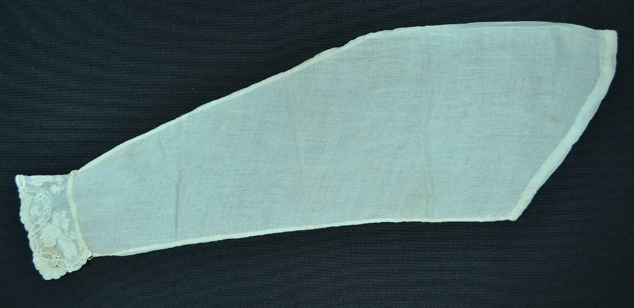 Una sottomanica in tela leggerissima bianca, in un pezzo, resa aderente da pince dal polso al gomito. Chiusa al fondo da bottoncino in vetro bianco e asola a d ago; applicato un risvolto in sottilissima tela bianca a ricamo meccanico in bianco con piccoli inserti sfilati ad effetto pizzo. La sottomanica copre l'intero braccio.