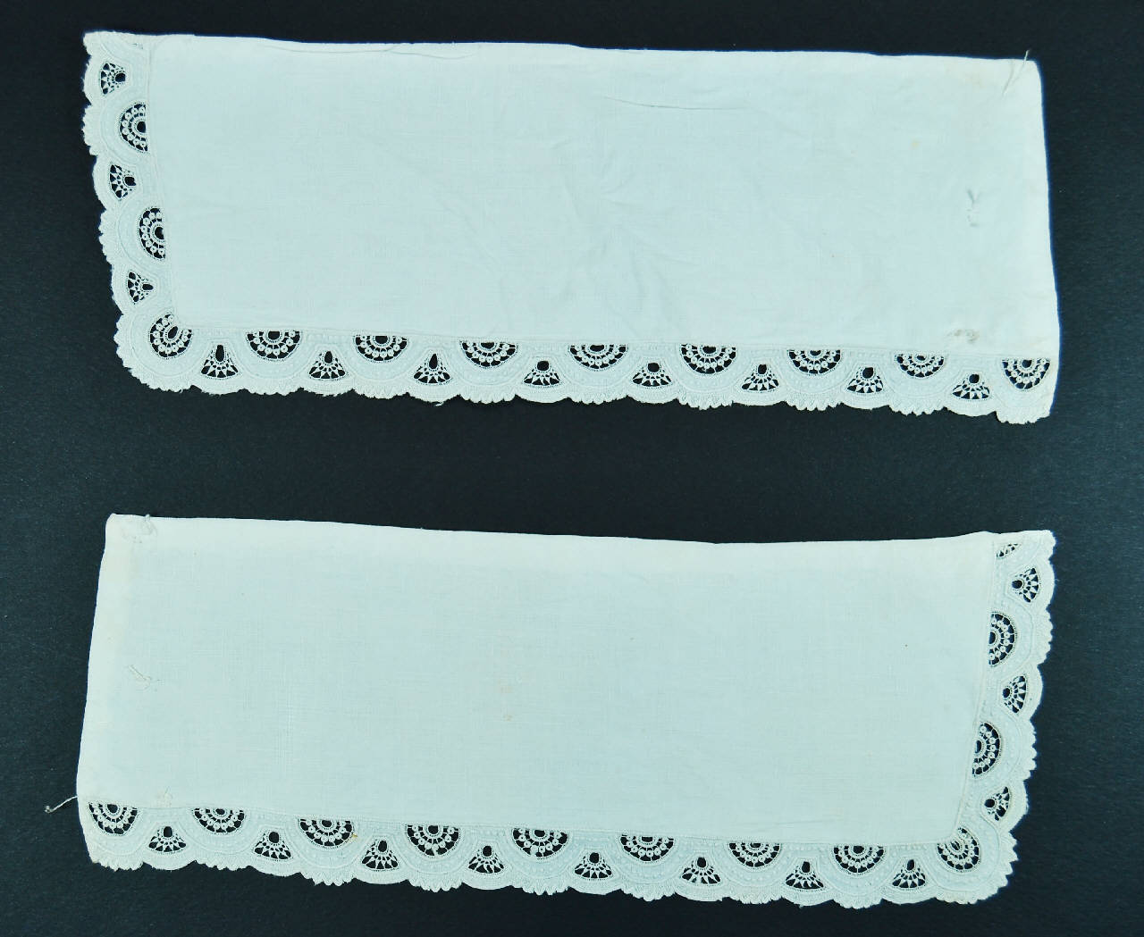 Paio di polsini rettangolari in tela bianca, decorati da bordo applicato in tela a ricamo meccanico in bianco. Motivo ad archi che formano smerli. Sono doppiati in tela di lino bianca. Chiusi da 3 bottoni (perduti) e 3 asole nascoste all'interno.