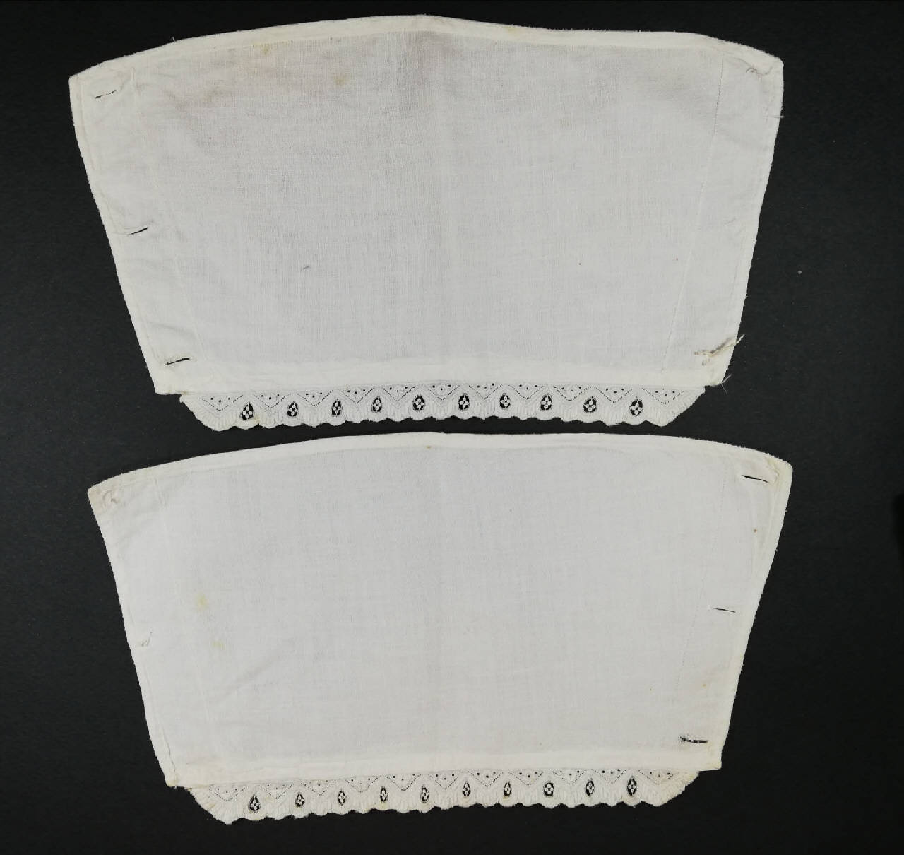 Paio di polsini svasati in tela bianca, decorati al bordo esterno da bordo applicato in tela bianca con ricamo meccanico tipo Sangallo. Chiusi da tre bottoni (perduti) e occhielli.