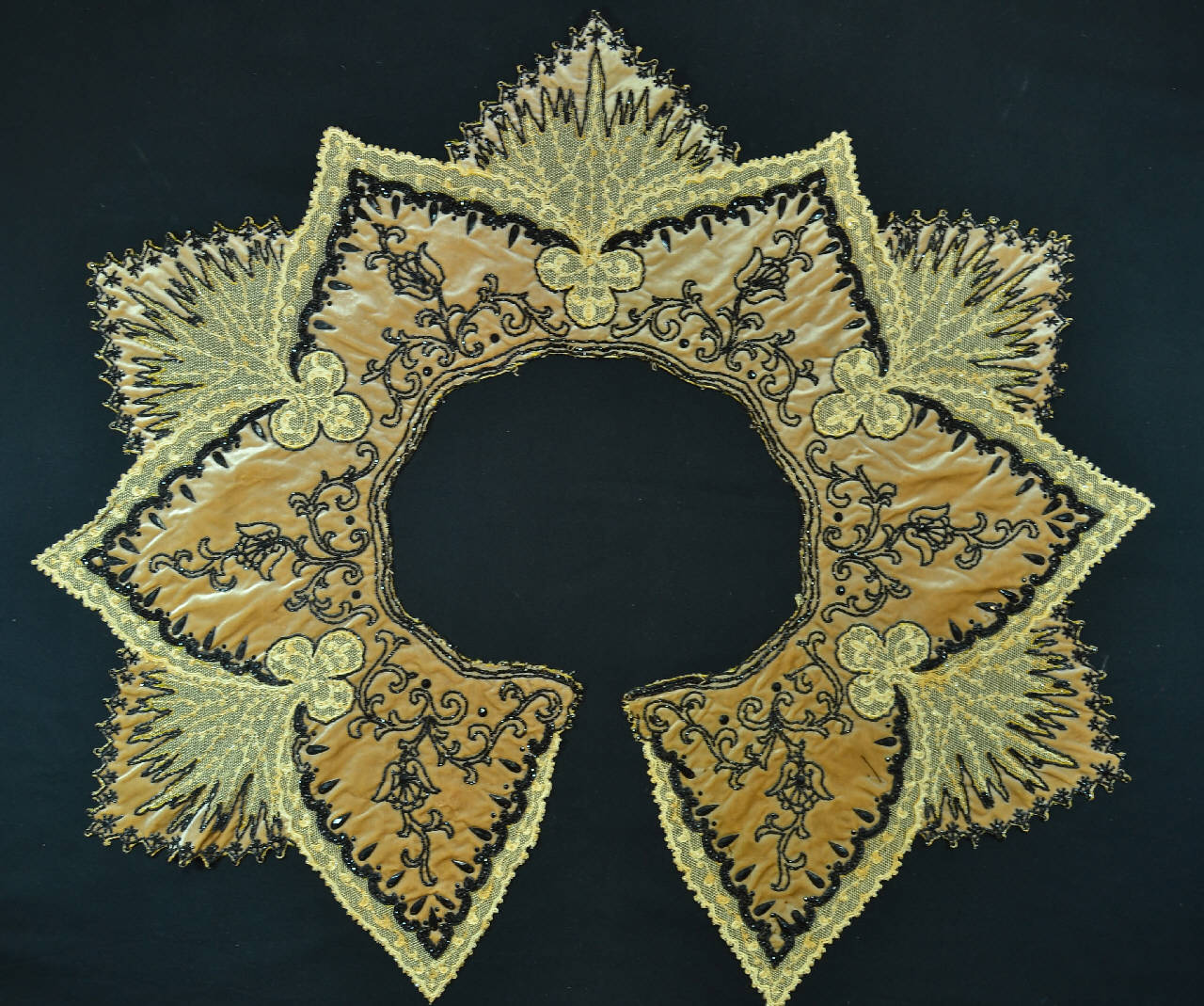 Gala decorativa a grandi punte triangolari per ampia scollatura ovale di abito femminile. In tulle avorio bobbinet ricamato a tambour work meccanico, sul quale è applicato velluto tagliato lilla chiarissimo che forma un motivo a punte più interno e profila con motivo frastagliato le punte in tulle. Il tulle è ricamato e decorato da perline sfaccettate in vetro avorio dorato. Sul velluto ricami in jais e perline di vetro nero in varie misure e forme, che delineano in ciascuna punta uno stelo con foglie e tulipano.