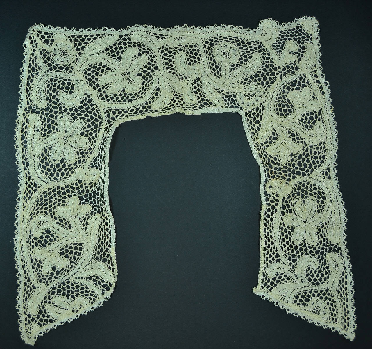 Collo a bavero squadrato, in lino naturale, a fuselli a fili continui tipo Milano. Fondo a rete a maglie esagonali a trecce, motivi dati da nastrino non continuo a p. tela con bordi traforati. Decoro a girali con foglie arcuate e bocci. Il merletto è stato tagliato e ricongiunto per formare gli angoli del collo. Bordino a fuselli ad archetti, cucito al margine esterno.