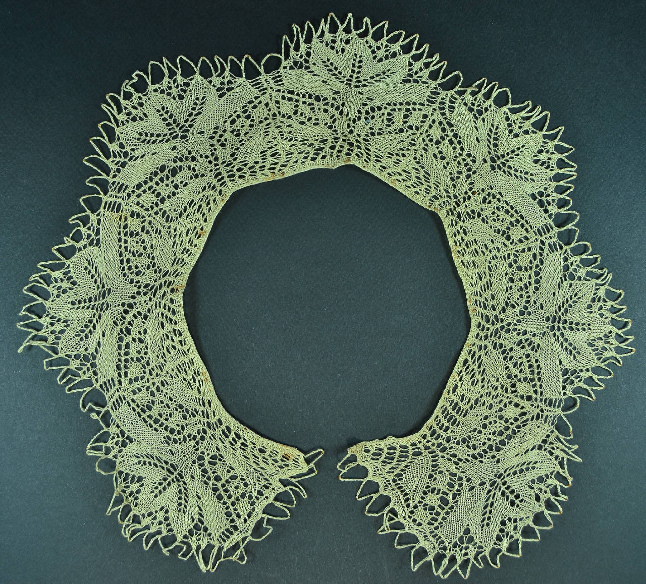 Collo piatto aperto, lavorato a ferri in lino naturale grigio. La lavorazione forma 7 grandi lobi decorati da corolla a tre petali su stelo con foglie. Bordo esterno a piccoli archetti ad uncinetto.