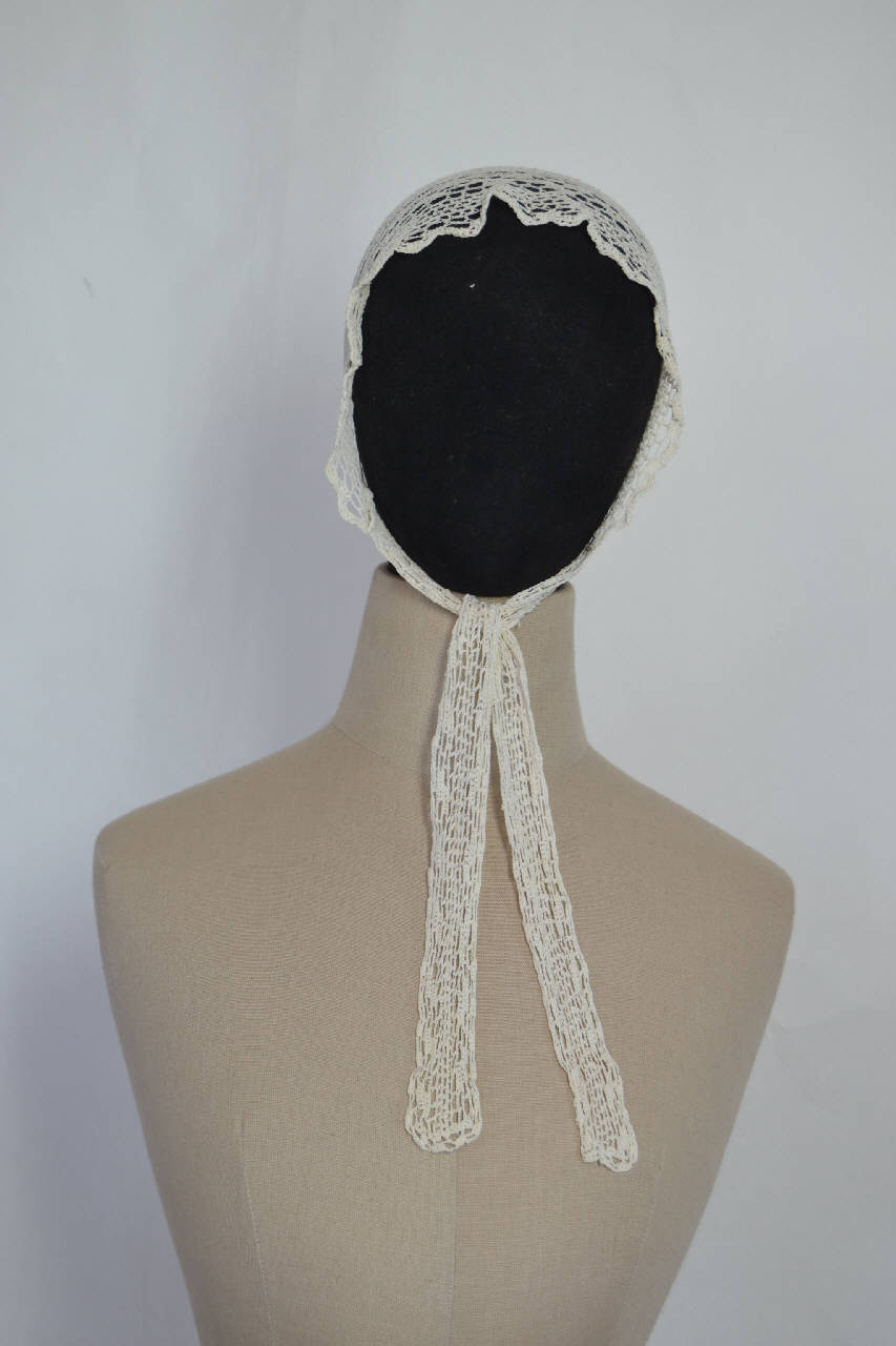 Cuffia bianca lavorata all'uncinetto, a p. catenella e a maglia alta. La parte posteriore è resa da motivo lavorato in tondo, con prosecuzione in giri di andata e ritorno che formano la parte anteriore. Lacci da annodare sotto il mento realizzati all'uncinetto. Decoro a cornici alternate a rete e a motivi pieni posti a scacchiera.