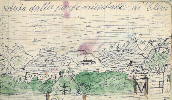 - NOTIZIE STORICO CRITICHE Serie di disegni conservati all'interno di un taccuino posseduto dall'artista Camillo Ghisi.\nSchizzo a china raffigurante la parte orientale del comune di Ello.