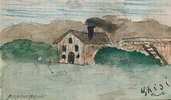 - NOTIZIE STORICO CRITICHE Serie di disegni conservati all'interno di un taccuino posseduto dall'artista Camillo Ghisi.\nSchizzo a china e tempera rappresentante una scena campestre con al centro della composizione una piccola abitazione.