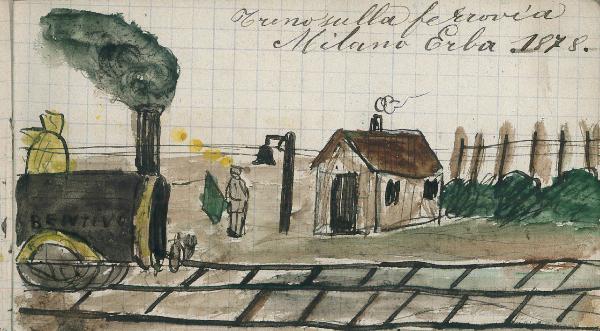 - NOTIZIE STORICO CRITICHE Serie di disegni conservati all'interno di un taccuino posseduto dall'artista Camillo Ghisi.\nPaesaggio raffigurante il passaggio di un treno sulla ferrovia che lega la città di Milano a quella di Erba.