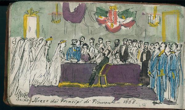 - NOTIZIE STORICO CRITICHE Serie di disegni conservati all'interno di un taccuino posseduto dall'artista Camillo Ghisi.\nScena raffigurante il matrimonio dei principi di Piemonte che si tenne a Torino nel 1868.