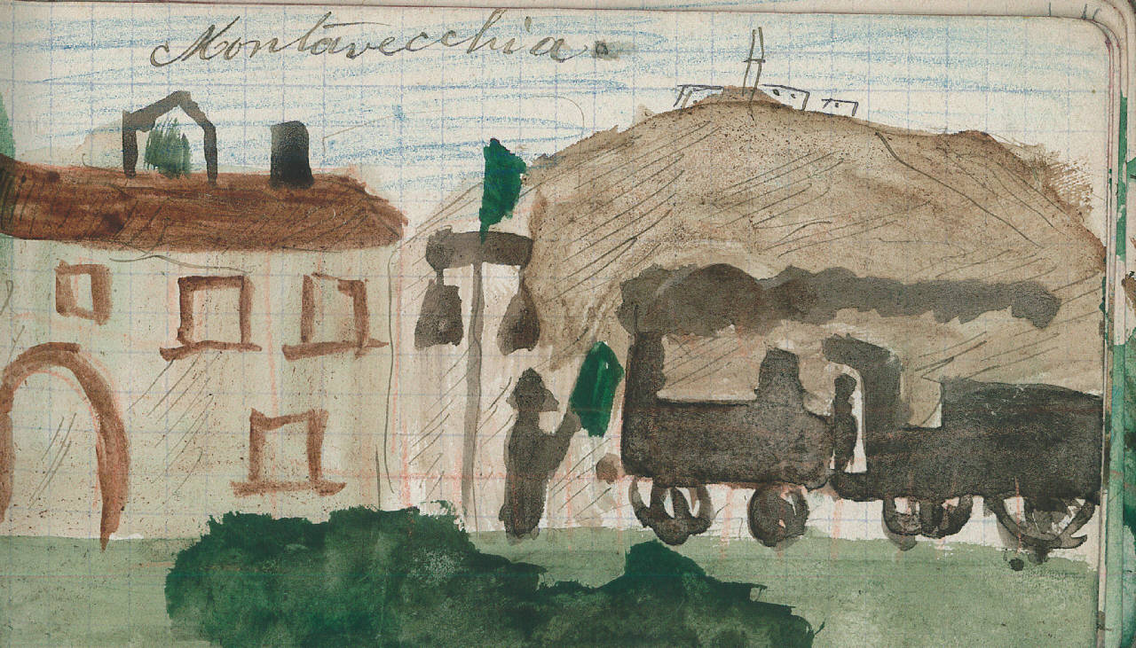 - NOTIZIE STORICO CRITICHE Serie di disegni conservati all'interno di un taccuino posseduto dall'artista Camillo Ghisi.\nScena raffigurante la stazione di Montavecchia locomotiva