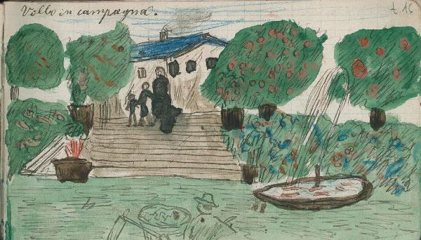 - NOTIZIE STORICO CRITICHE Serie di disegni conservati all'interno di un taccuino posseduto dall'artista Camillo Ghisi.\nScena raffigurante il profilo di una villa di campagna con scalinata. Sono presenti 4 figure umane, due bambini, un uomo ed una donna.