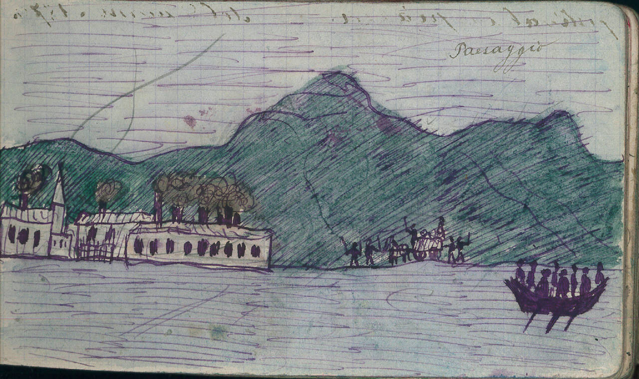 - NOTIZIE STORICO CRITICHE Serie di disegni conservati all'interno di un taccuino posseduto dall'artista Camillo Ghisi.\nScena raffigurante un paesaggio lacustre con una imbarcazione sulla destra ed alcune figure umane sullo sfondo accanto ad un carro.