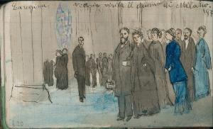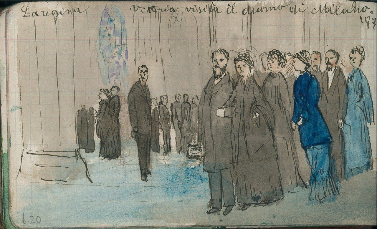 - NOTIZIE STORICO CRITICHE Serie di disegni conservati all'interno di un taccuino posseduto dall'artista Camillo Ghisi.\nScena raffigurante un la regina Vittoria in visita al Dumo di Milano nel 1879.