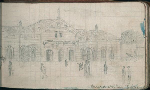 - NOTIZIE STORICO CRITICHE Serie di disegni conservati all'interno di un taccuino posseduto dall'artista Camillo Ghisi.\nScena raffigurante il piazzale d'ingresso della stazione che collega Milano alla città di Erba.