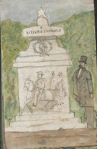 - NOTIZIE STORICO CRITICHE Serie di disegni conservati all'interno di un taccuino posseduto dall'artista Camillo Ghisi.\nScena raffigurante un monumento celebrativo dedicato a Vittorio Emanuele. Sul basamento un basso rilievo del Sovrano a cavallo. Alla destra del foglio un uomo, in abiti cicili, osserva il monumento.