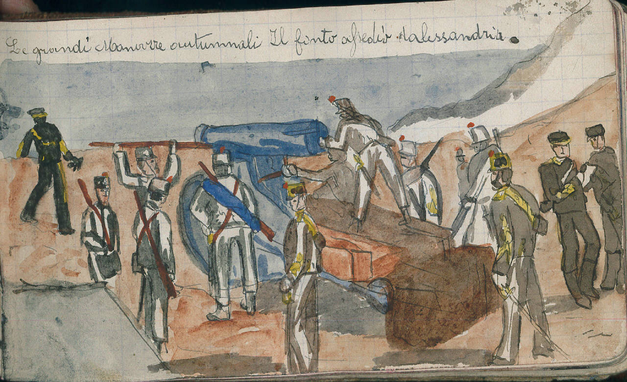 - NOTIZIE STORICO CRITICHE Serie di disegni conservati all'interno di un taccuino posseduto dall'artista Camillo Ghisi.\nScena raffigurante la rievocazione storica dell'assedio di Alessandria.