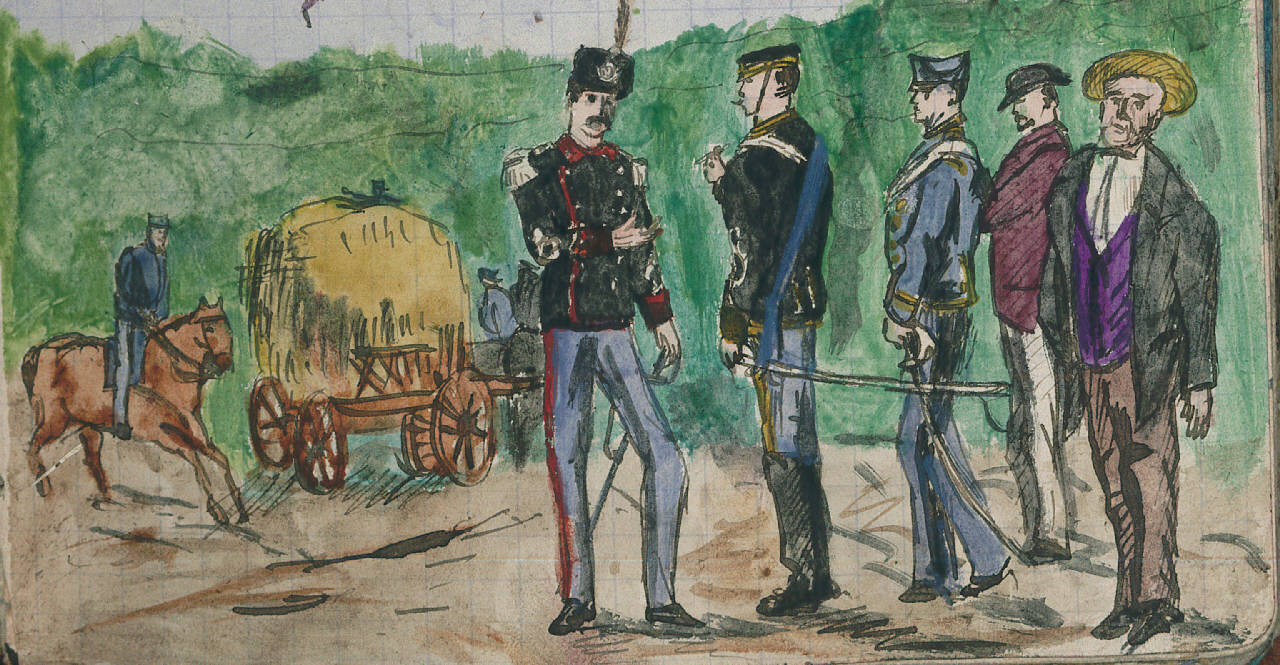 - NOTIZIE STORICO CRITICHE Serie di disegni conservati all'interno di un taccuino posseduto dall'artista Camillo Ghisi.\nLa scena raffigura il colloquio tra due membri dell'esercito.