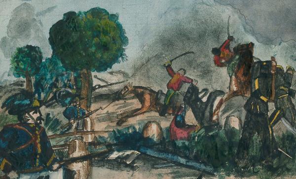 - NOTIZIE STORICO CRITICHE Serie di disegni conservati all'interno di un taccuino posseduto dall'artista Camillo Ghishi.\nLa scena raffigura una una battaglia cruenta.