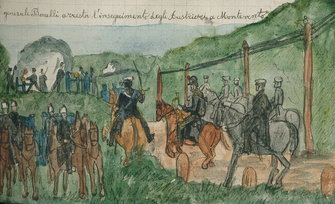 - NOTIZIE STORICO CRITICHE Serie di disegni conservati all'interno di un taccuino posseduto dall'artista Camillo Ghishi.\nLa scena raffigura il Generale Bonelli mentre arresta l'inseguimento degli Austriaci a Montevento.