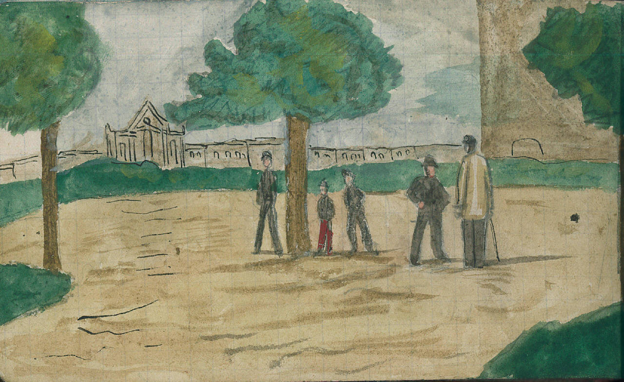 - NOTIZIE STORICO CRITICHE Serie di disegni conservati all'interno di un taccuino posseduto dall'artista Camillo Ghishi.\nLa scena raffigura un paesaggio con alcune figure umane in primo piano mentre sullo sfondo si intravedono alcune architetture.
