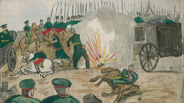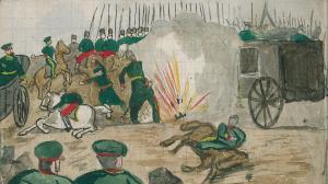 - NOTIZIE STORICO CRITICHE Serie di disegni conservati all'interno di un taccuino posseduto dall'artista Camillo Ghishi.\nLa scena raffigura il momento in cui una truppa militare viene colpita da una granata.