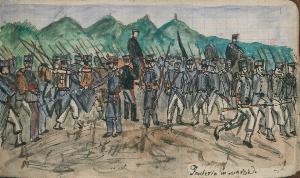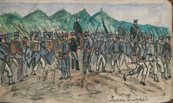 - NOTIZIE STORICO CRITICHE Serie di disegni conservati all'interno di un taccuino posseduto dall'artista Camillo Ghishi.\nLa scena raffigura l'esercito di fanteria in marcia.