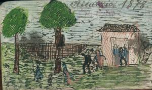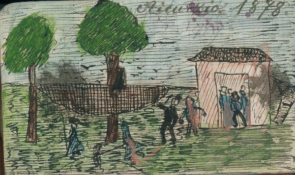 - NOTIZIE STORICO CRITICHE Serie di disegni conservati all'interno di un taccuino posseduto dall'artista Camillo Ghishi.\nLa scena raffigura un momento di riposo e festa ad Aicurzio (MB) nel 1878