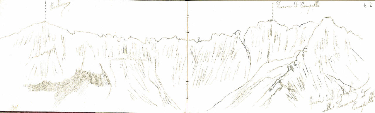 - NOTIZIE STORICO CRITICHE Serie di disegni conservati all'interno di un taccuino posseduto dall'artista Camillo Ghishi.\n Il disegno rappresenta il profilo delle monntagne partendo dalla cresta dal Barbisino allo Zuccone di Campelli.\nIl taccuino viene indicato nel registro di carico al n° 34305