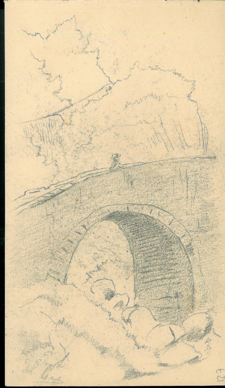 - NOTIZIE STORICO CRITICHE Serie di disegni conservati all'interno di un taccuino posseduto dall'artista Camillo Ghisi. \nIl soggetto raffigura un paesaggio montano fluviale attraversato da un ponte in muratura.\nIl taccuino viene indicato nel registro di carico al n° 34305