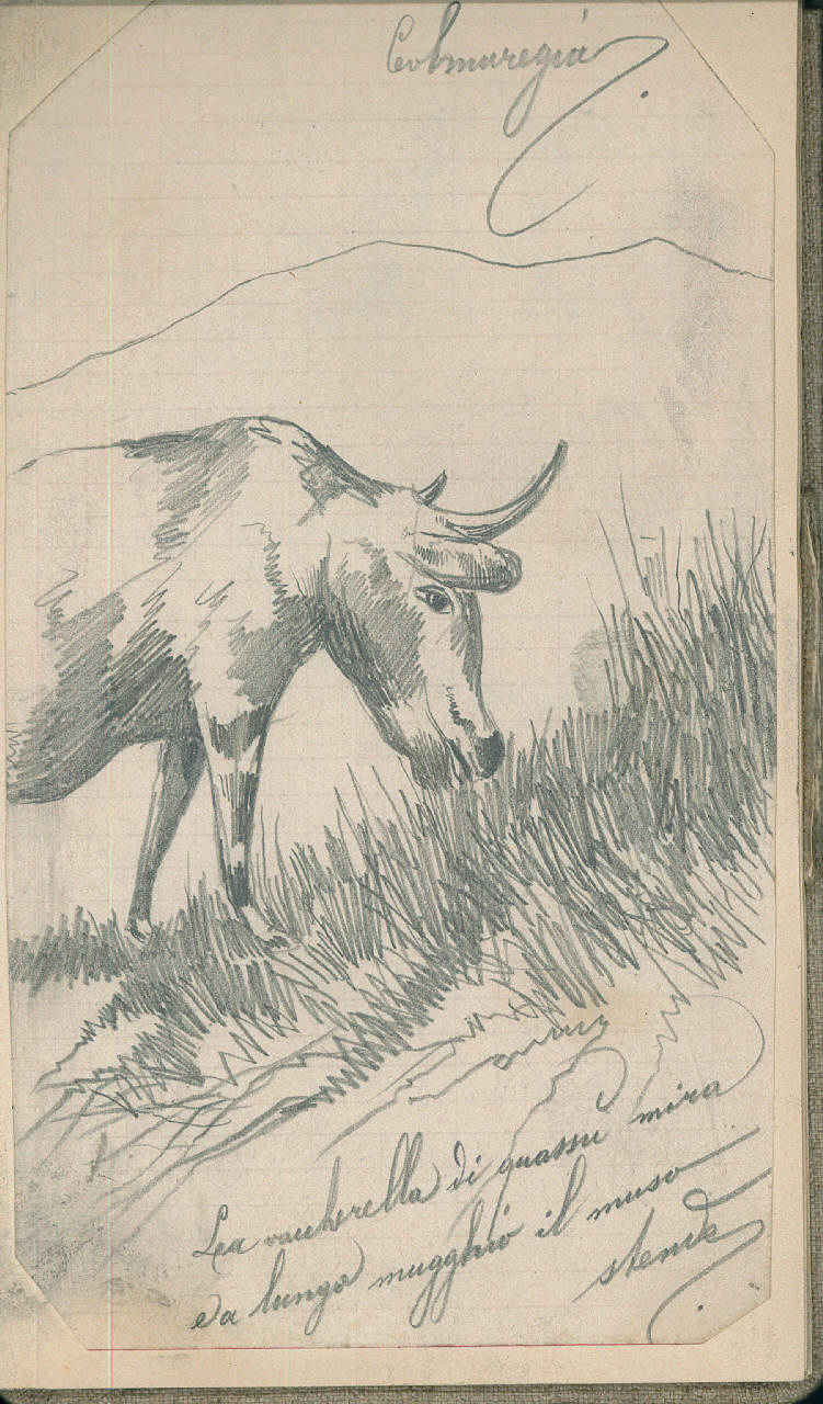 - NOTIZIE STORICO CRITICHE Serie di disegni conservati all'interno di un taccuino posseduto dall'artista Camillo Ghisi. \nIl soggetto raffigura il profilo di una vacca al pascolo.\nIl taccuino viene indicato nel registro di carico al n° 34305
