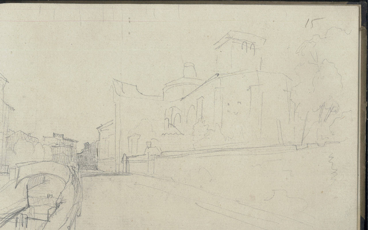 - NOTIZIE STORICO CRITICHE Parte del taccuino "Raccolta Bisi n. 448 D/ Fondo Bisi Cart. P. 8 n.4".\nLa tavola raffigura la chiesa di Santa Maria delle Grazie vista da Corso Magenta, Milano o la chiesa di San Cristoforo.