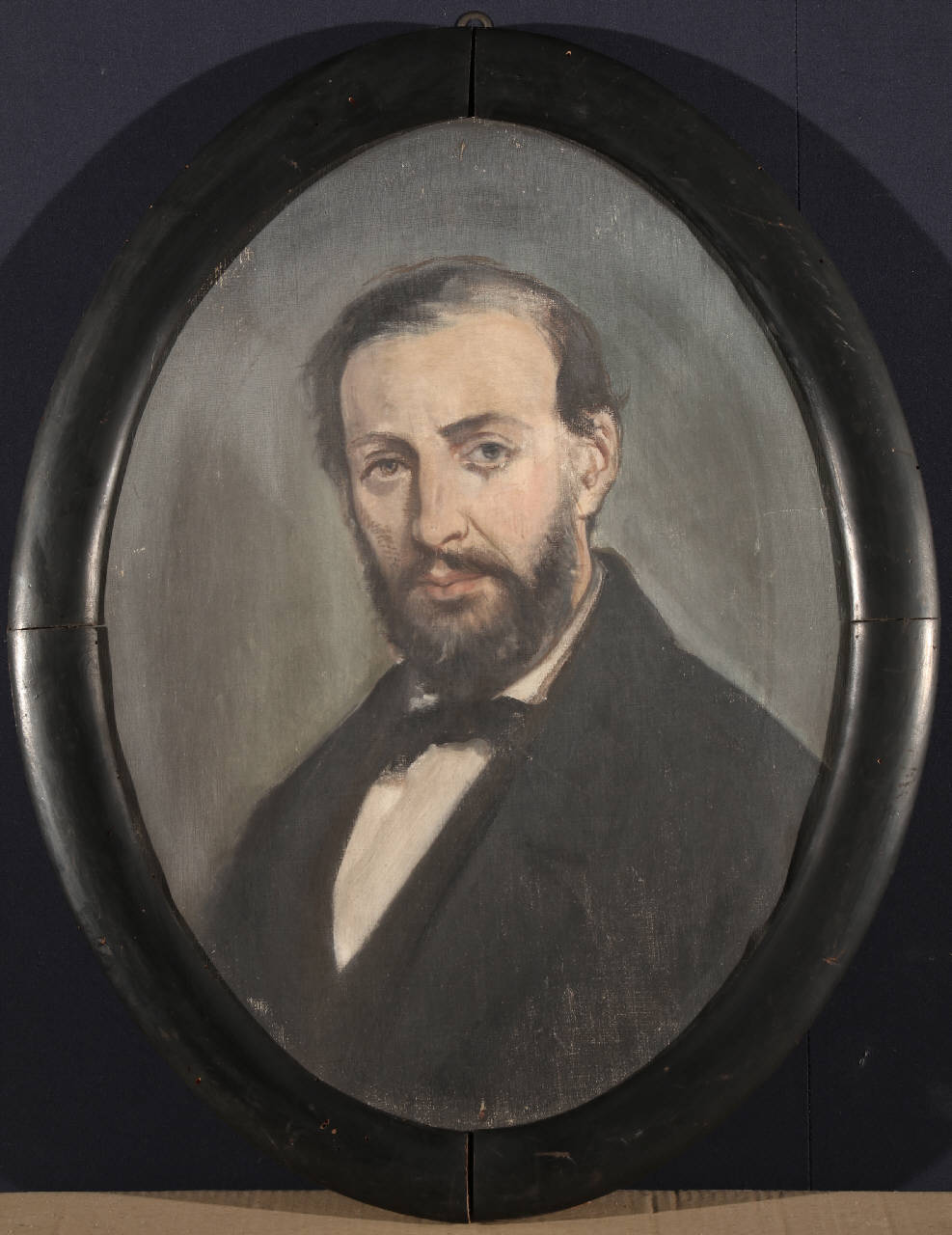 Dipinto su tela ovale con ritratto maschile a mezzo busto di tre quarti