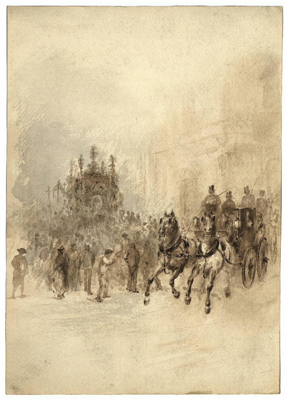 Veduta di un corteo con uomini a piedi, sulla destra compare una carrozza trainata da due cavalli. il disegno è realizzato su carta con acquarellatura color seppia. Nella scena si intravedono elementi architettonici.