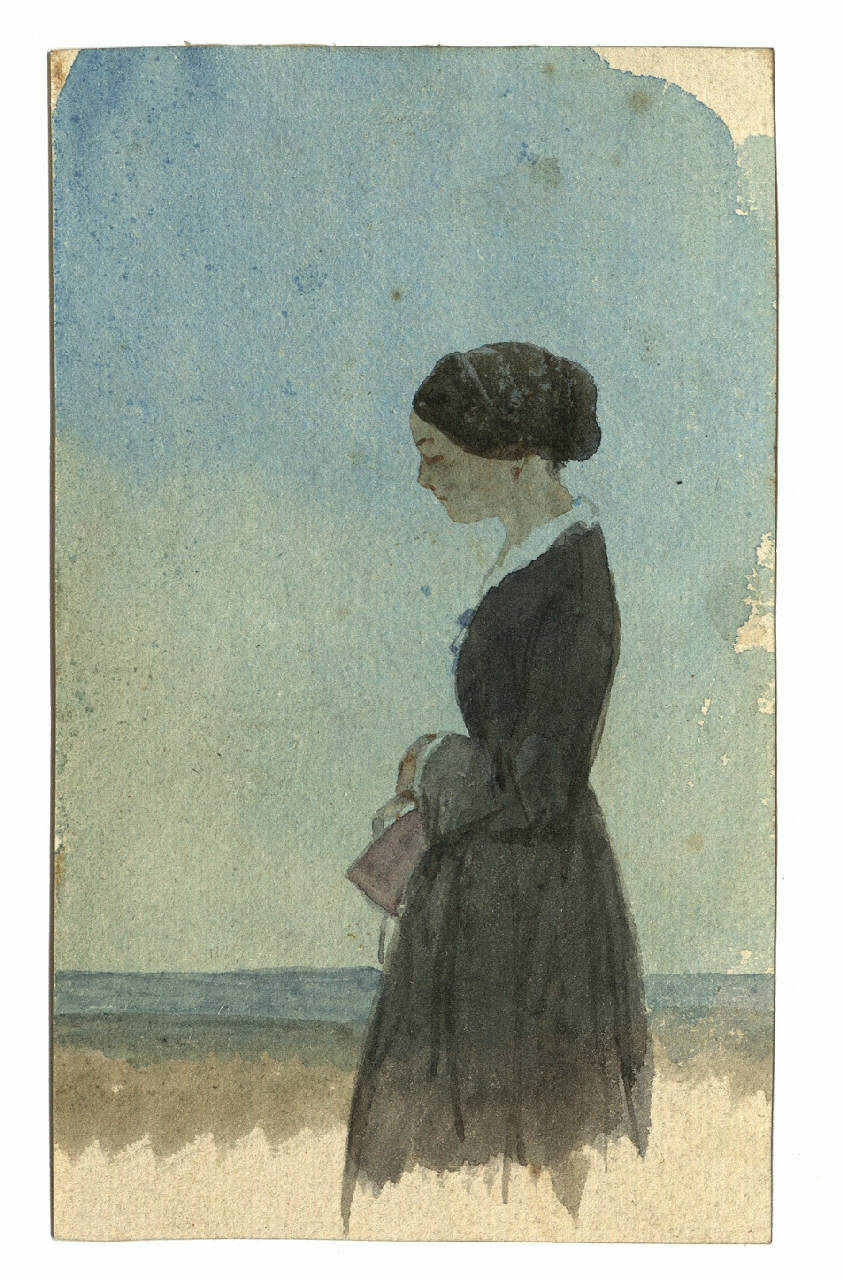 Disegno ad acquarello su carta. Al centro una figura di dama con capelli scuri raccolti e abito nero su sfondo chiaro.