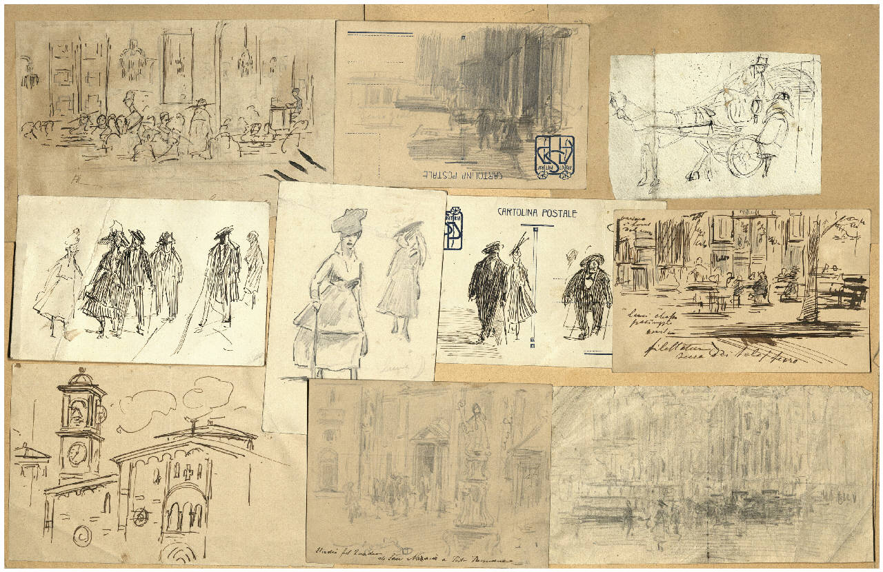 Il foglio contiene dieci schizzi raffiguranti scene di guerra e figure da inserire in quadri di guerra. Si riconoscono grazie agli appunti dell'autore alcuni scorci di Milano quali San Nazario, San Babila, Porta Romana.