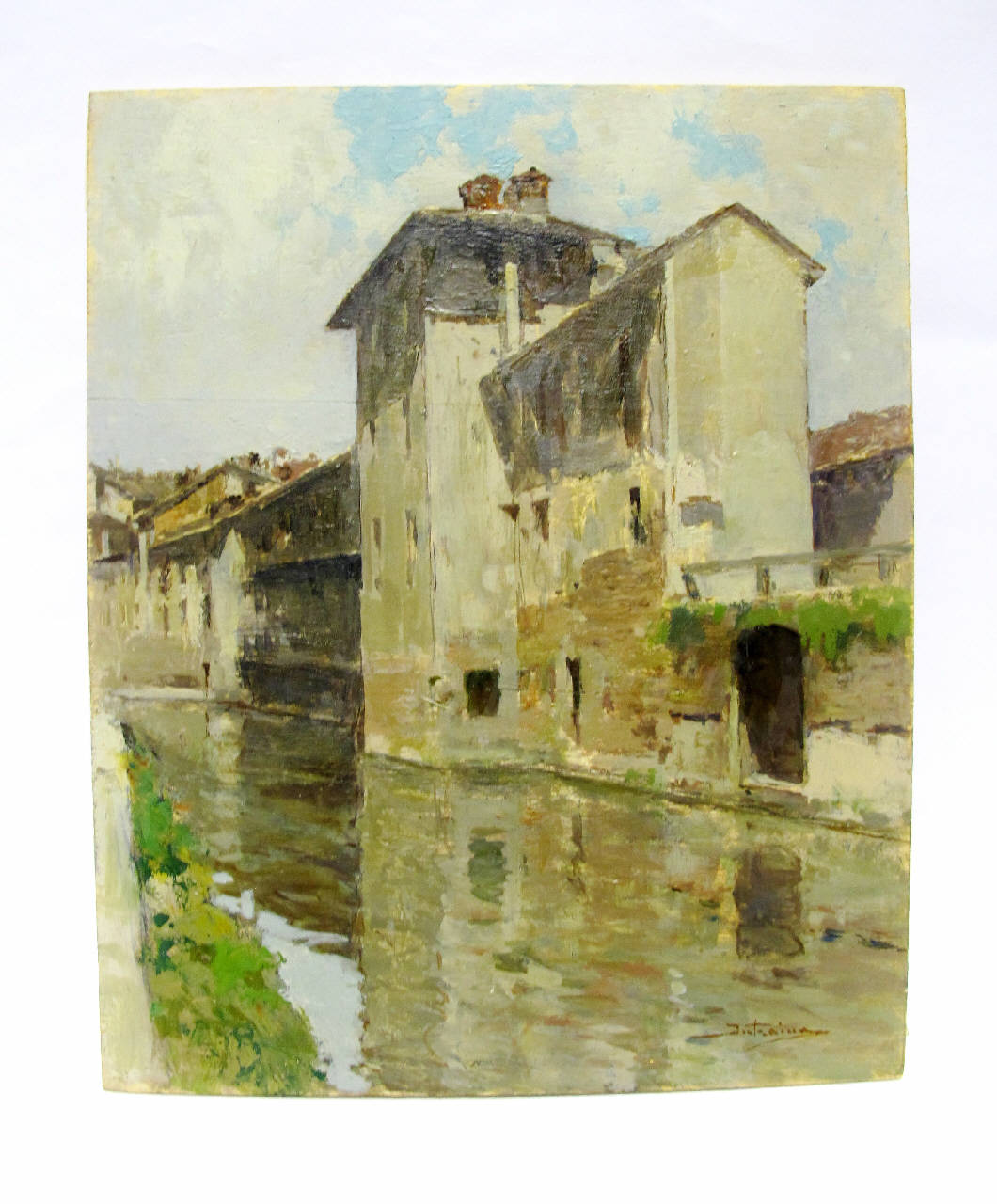 tavola dipinta ad olio raffifurante una veduta del naviglio in via vallone
