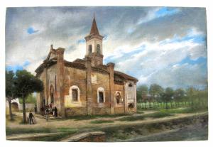 Seta dipinta a tempera cucita su cartoncino raffigurante la veduta della Chiesa di San Cristoforo