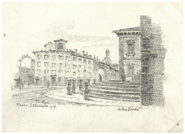 Disegno a matita raffigurante Piazza Sant'Alessandro a Milano, datato e firmato. \nIl disegno si trova all'interno di un album contenente una raccolta di disegni di Arturo Ferrari.