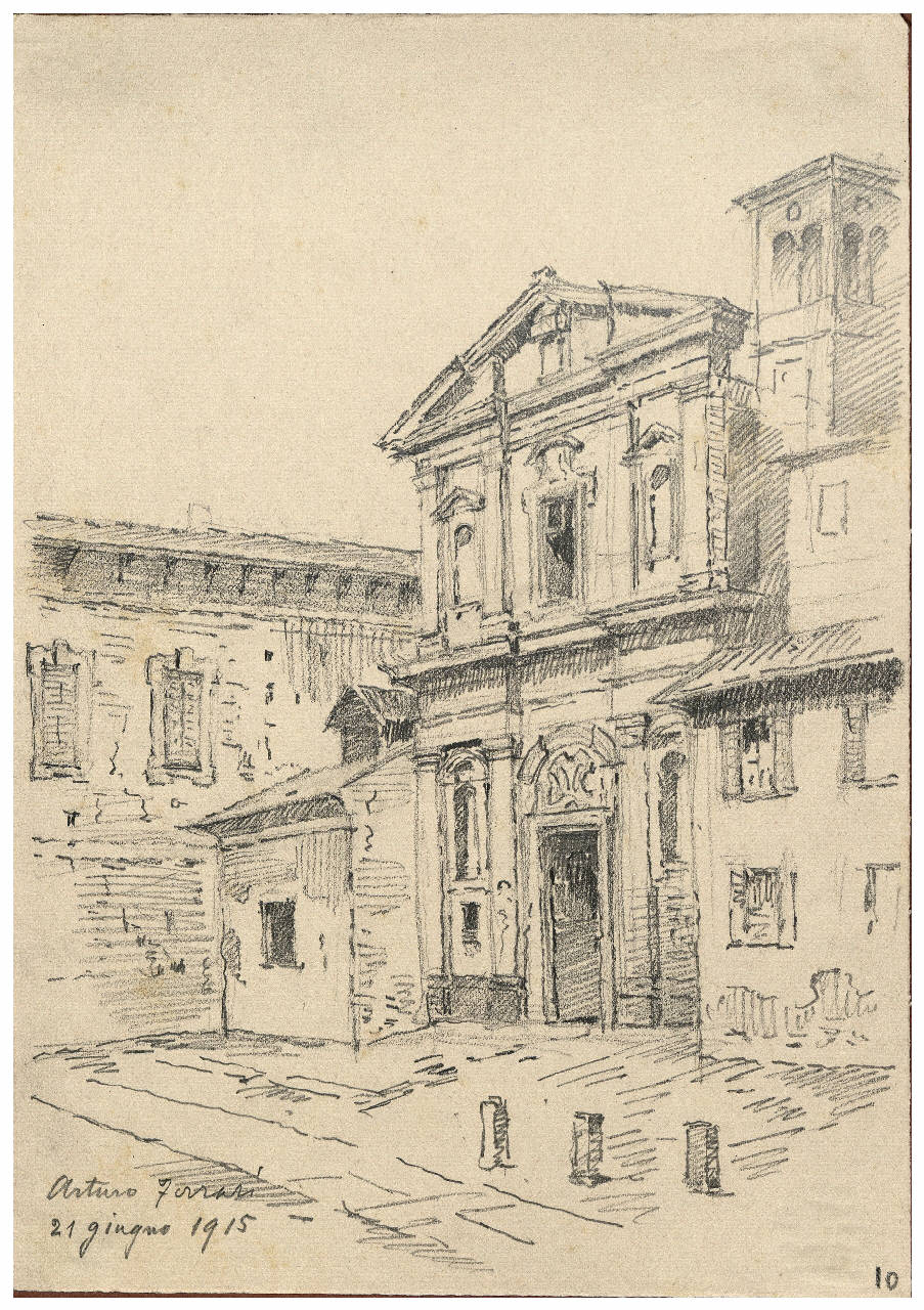 Disegno a matita raffigurante la veduta della Chiesa di S. Stefano a Milano. \nIl disegno si trova all'interno di un album contenente una raccolta di disegni di Arturo Ferrari.