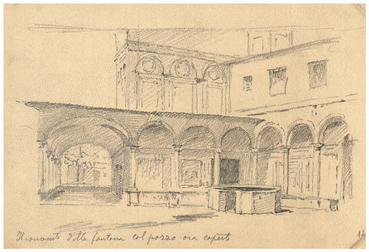 Disegno a matita raffigurante la veduta dell'Antico Chiostro della Fontana ora coperto.\nIl disegno si trova all'interno di un album contenente una raccolta di disegni di Arturo Ferrari.