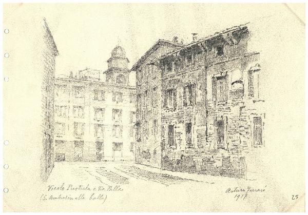 Disegno a matita raffigurante Vicolo Pusterla e Via Palla.\nIl disegno si trova all'interno di un album contenente una raccolta di disegni di Arturo Ferrari.