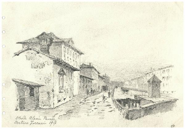 Disegno a matita raffigurante la Strada presso il naviglio Alzaia Pavese\nIl disegno si trova all'interno di un album contenente una raccolta di disegni di Arturo Ferrari.